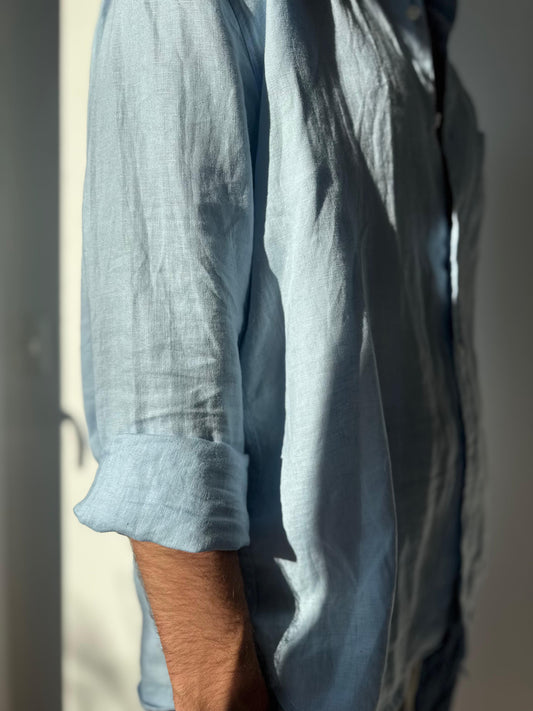 CAMISA LINO CELESTE CON BOTONES DE COCO